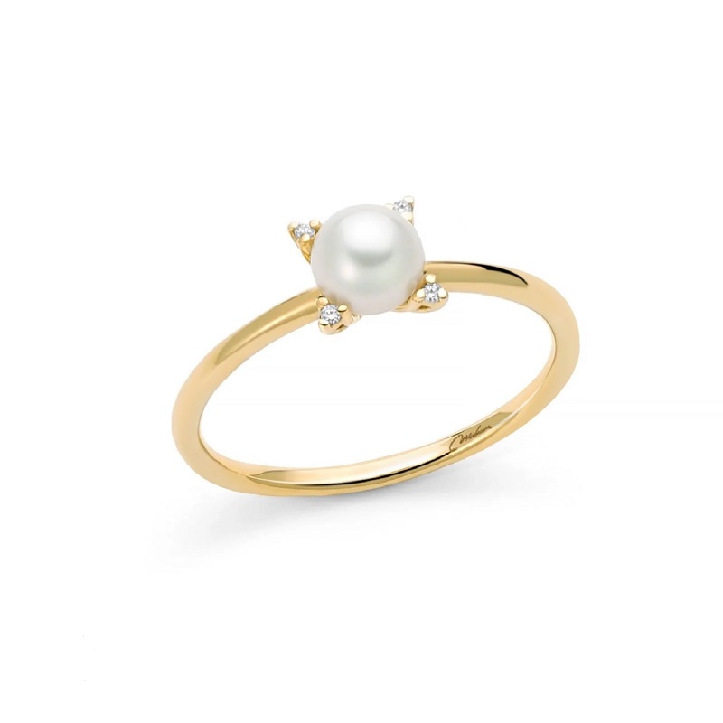 Anello da donna Miluna misura 14, in oro giallo 9kt. Anellino con perla coltivata di colore bianco e di diametro 5-5,5mm, impreziosito da 4 diamanti naturali 1,32 punti totali, G color, purezza SI taglio brillante. Tutti i gioielli Miluna sono dotati di astuccio, shopper originale, garanzia di qualità.