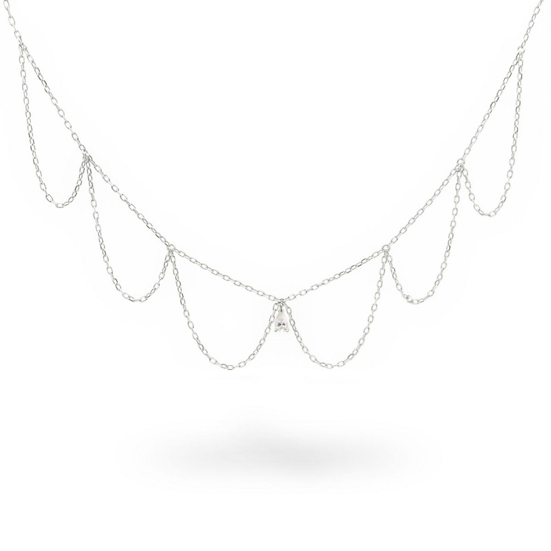 Collana Rue Des Mille collezione Cleo, lunga 30cm più 5cm di allungo e con chiusura a moschettone, in argento 925 con galvanica in rodio. Girocollo con zircone pendente a goccia di colore bianco e collana merletto. La collezione Cleo (da Cleopatra) è un tributo all’eleganza regale e allo splendore senza tempo, unendo il fascino delle frange fluide con la luminosità del pavé di zirconi, creando pezzi che sono al contempo sofisticati e vistosi. Le frange, leggere e dinamiche, si muovono con grazia, mentre gli zirconi, incastonati con maestria, donano una brillantezza che cattura ogni sguardo. Cleo è pensata per donne che desiderano indossare gioielli dal carattere forte e distintivo, che coniugano la bellezza classica con un tocco di modernità audace, perfetta quindi per chi cerca uno stile che non passi inosservato. Tutti i gioielli Rue Des Mille sono dotati di astuccio, shopper e garanzia di qualità.