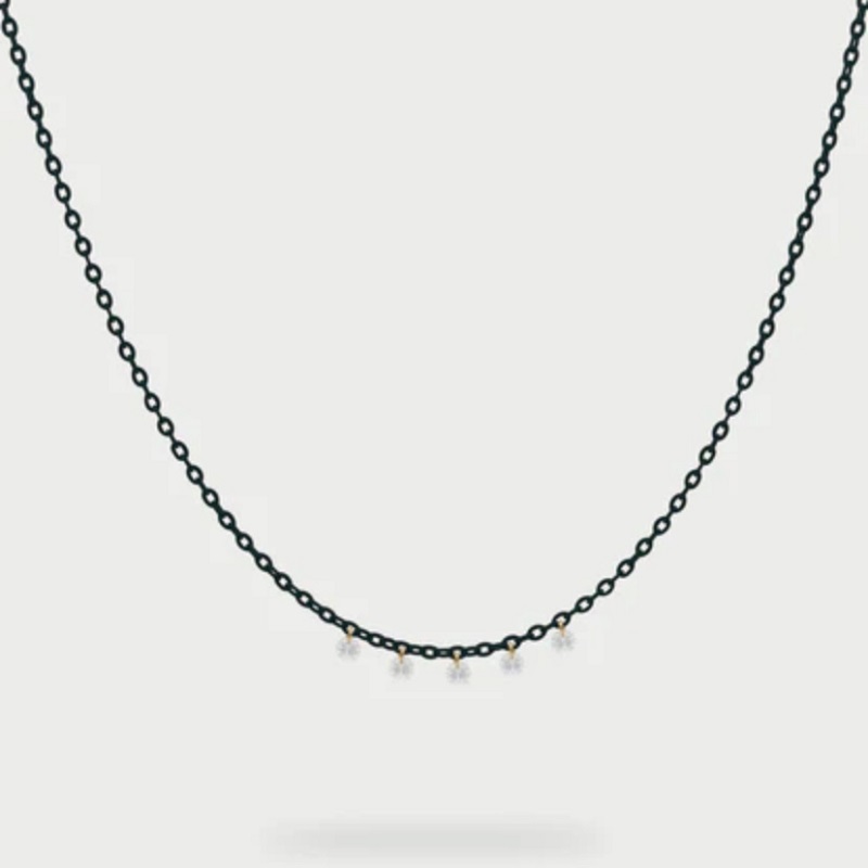 Collana da donna Rue Des Mille collezione Gipsy Noir, lunga 39cm più 5cm di allungo e con chiusura a moschettone. Questo girocollo della collezione Gipsy Chic, vivace e contemporaneo, è pensato per chi ama i dettagli che fanno la differenza. Realizzato in argento 925 con galvanica oro giallo 18kt e completamente verniciato con smalto ultra resistente di colore nero, regalando un effetto brillante. Cinque zirconi pendenti di colore bianco, aggiungono movimento e luminosità, creando un contrasto delicato ma di forte impatto. Perfetto da indossare da solo come punto luce sul collo o da mixare con altre collane per un layering creativo e originale. Gipsy Noir è la collezione che reinterpreta lo spirito libero e boho in chiave dark ed elegante. Una versione intensa e profonda della iconica Gipsy Chic, Gipsy Noir abbraccia le sfumature del nero con dettagli preziosi e un’estetica decisa. Ogni gioiello è pensato per chi cerca accessori versatili ma di carattere, capaci di raccontare uno stile personale e inconfondibile, con Gipsy Noir, ogni look diventa un’affermazione di libertà, intensità ed eleganza contemporanea. Tutti i gioielli Rue Des Mille sono dotati di astuccio, shopper originale e garanzia di qualità.