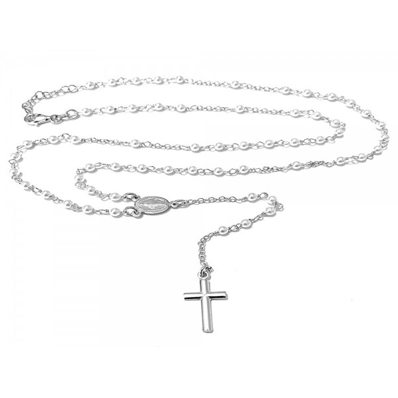 Collana da uomo e da donna modello rosario in argento 925 colore silver, peso 5,2gr, lunga 50cm e con chiusura ad anello. Girocollo con 50 “grani”, con crocetta pendente e medaglietta con raffigurata la Madonna Miracolosa. L’astuccio è un sacchetto in velluto di colore blu.