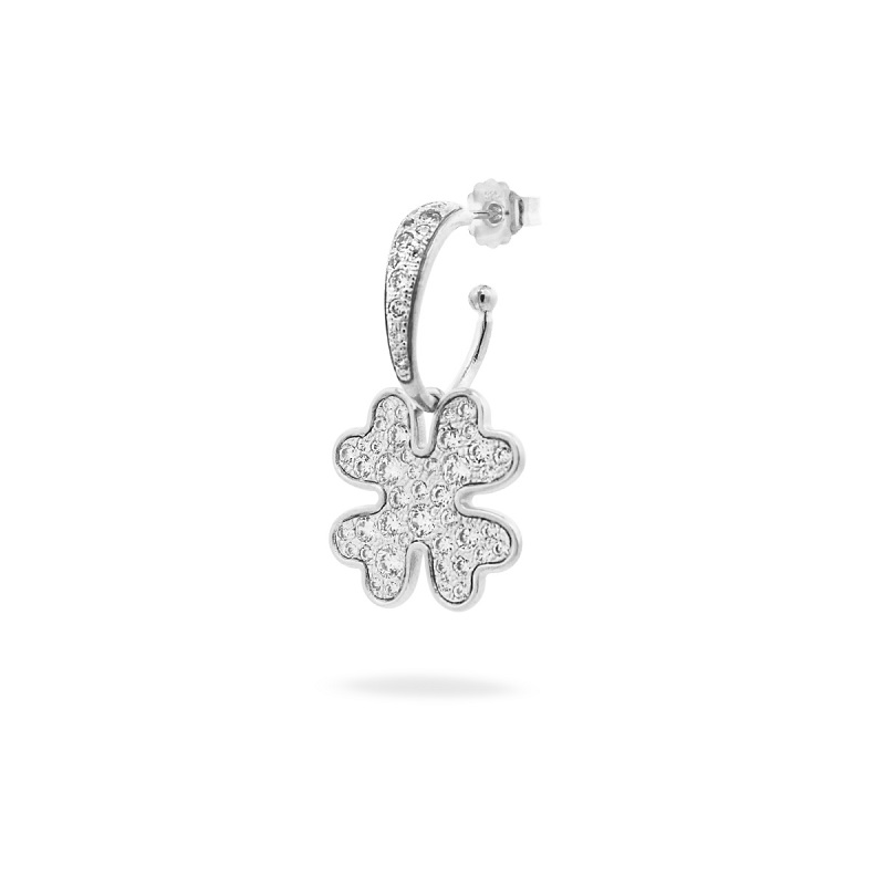 Mono Orecchino da donna Rue Des Mille collezione Stardust Ten, lungo 3cm, con chiusura a farfallina, in argento 925 con galvanica in rodio. Orecchino singolo con semicerchio di diametro 1,5cm e pendente a forma di quadrifoglio oversized di dimensioni 1,5cm, impreziosito da un pavè di zirconi di colore bianco. Stardust TEN è la collezione dedicata a chi ama i gioielli realizzati con pavé di pietre luccicanti, da indossare in quantità, per un effetto ultra luminoso. In questa evoluzione i gioielli acquistano più spazio e carisma, si aggiungono nuove forme e combinazioni. Si preannuncia una stagione ad alto tasso di scintille. Tutti i gioielli Rue Des Mille sono dotati di astuccio, shopper originale e garanzia di qualità.