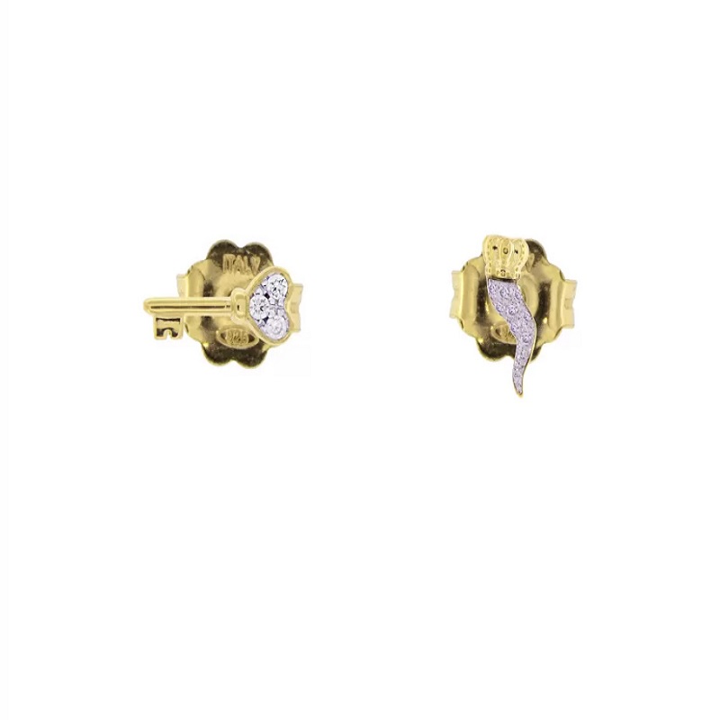 Orecchini da donna Rue Des Mille collezione Stardust Double in argento 925 con galvanica in oro giallo 18kt impreziositi da micro zirconi di colore bianco. Orecchini al lobo, adatti anche per le bimbe, a forma di chiave e cornetto, con chiusura a farfallina. Tutti i gioielli Rue Des Mille sono dotati di astuccio, shopper e garanzia di qualità.